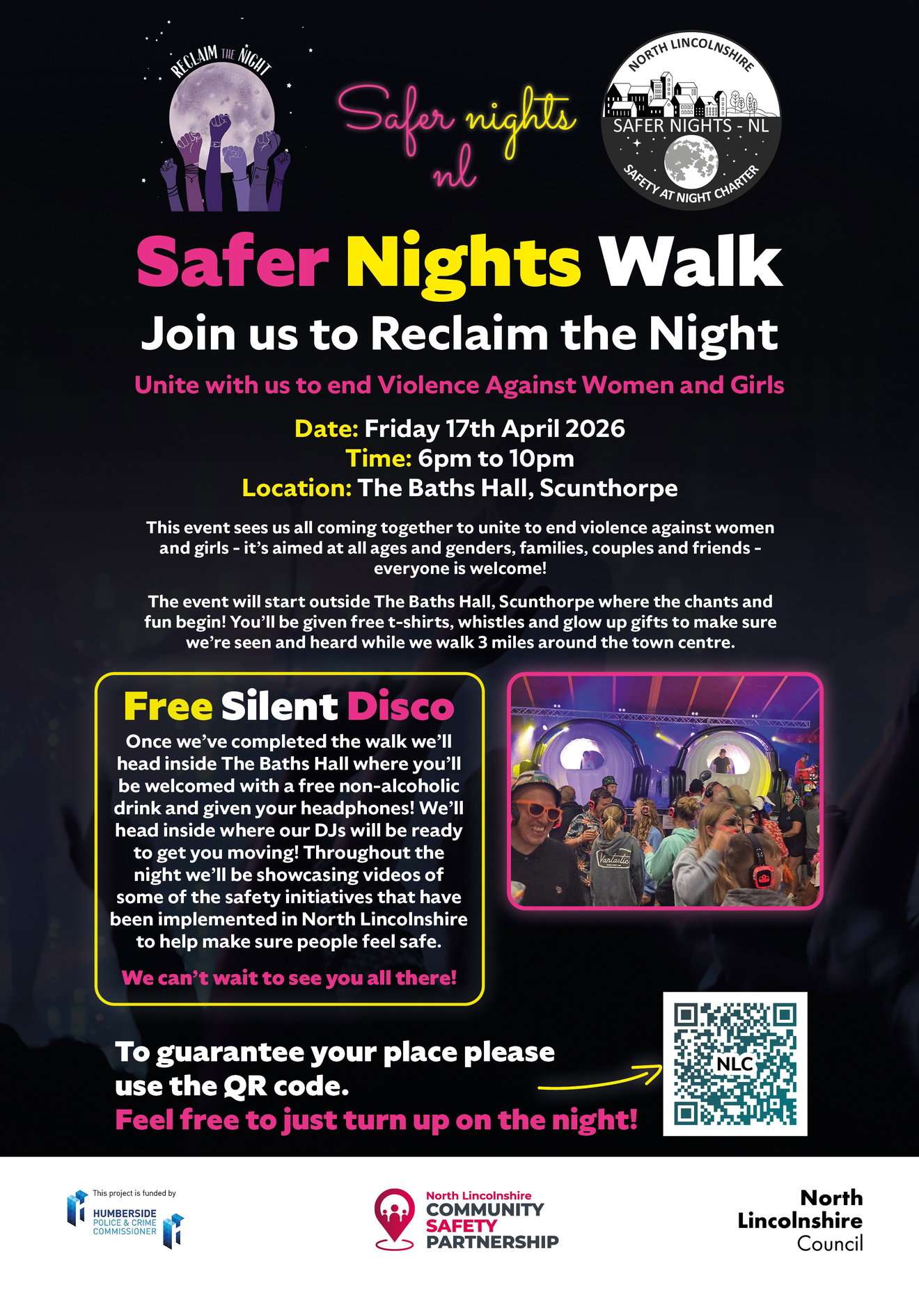 Once we've completed the walk we'll head inside the Bath's Hall where you'll be welcomed with a free non-alcoholic drink and given your headphones. We'll head inside where our DJ's will be ready to get you moving! Throughout the night we'll be showcasing videos of some of the safety initiatives that have been implemented in North Lincolnshire to help make sure people feel safe.